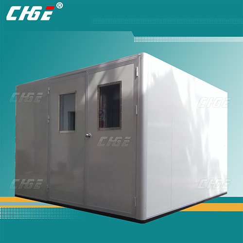 3.1 墻體材料:庫體五面采用雙面彩鋼巖棉保溫庫板(EPS計算機色)拼裝而成,固定支撐鋁材橫梁,鋁型材板包邊;底部焊接底架,根據客戶產品重量設計相應承重的底坐,并設計腳輪,整體為可移動式,接合處打密封玻璃膠,有效保證房間的密封性,室內用于放置產品老化車。